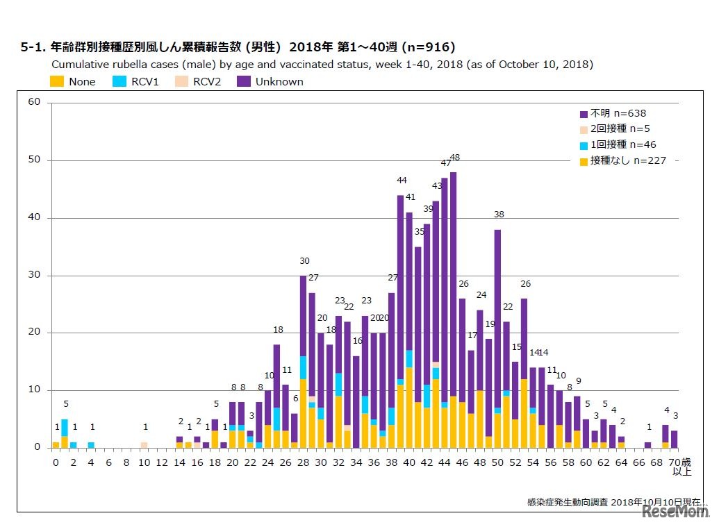 画像出典:国立感染症研究所 年齢群別接種歴別風しん累積報告数(男性)2018年 第1~40週