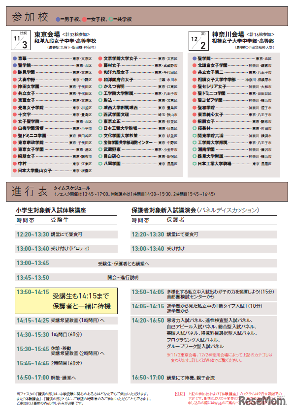 首都圏模試センターは「新入試体験!私立中コラボフェスタ」を開催する。会場は、2018年11月3日は和洋九段女子中学・高等学校、12月2日は相模女子大学中学部。小学3~6年生と保護者を対象に実施する。要事前申込み。参加費無料。