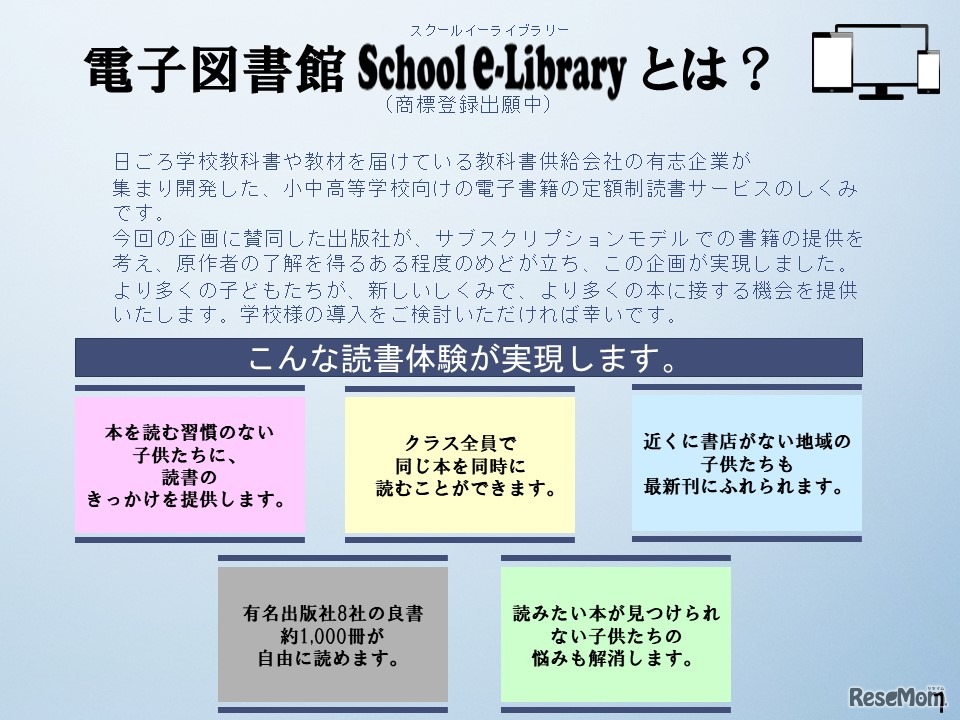 eライブラリー有限責任事業組合は2019年4月より、全国の教科書供給会社の有志29社と出版社企業8社が共同開発した小中高等学校向けの電子書籍サービス「School e-Library(スクール イー ライブラリー)」を有料で提供する。