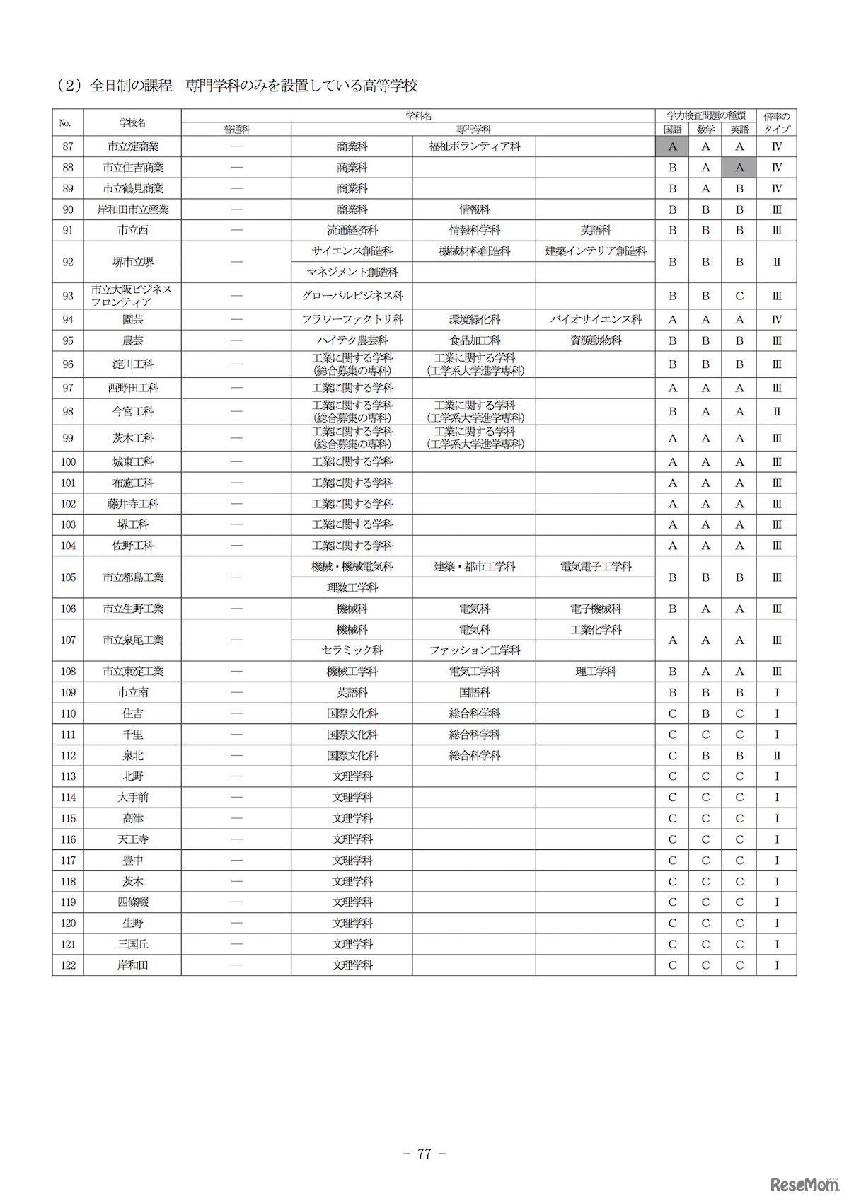 画像出典:平成31年度(2019年度)大阪府公立高等学校入学者選抜実施要項(2018年10月15日公表) 2019年度一般入学者選抜 学力検査問題の種類、学力検査の成績および調査書の評定にかける倍率のタイプ(全日制の課程・専門学科のみを設置している高校)