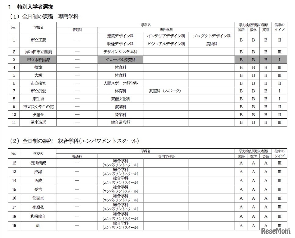 2019年度特別入学者選抜 学力検査問題の種類、学力検査の成績および調査書の評定にかける倍率のタイプ(全日制の課程・専門学科と総合学科(エンパワメントスクール))