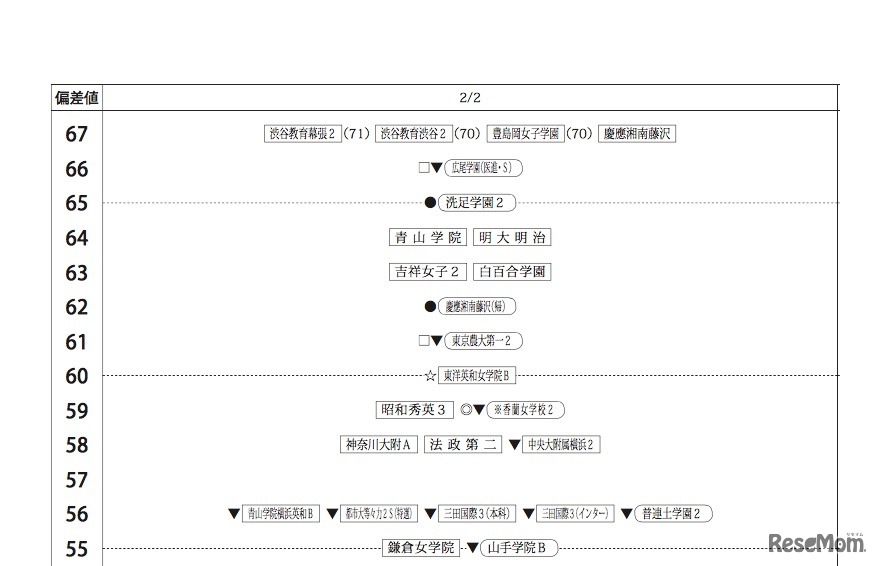 四谷大塚「合不合判定テスト(第3回)80偏差値一覧」2018年9月16日実施 2月2日・女子