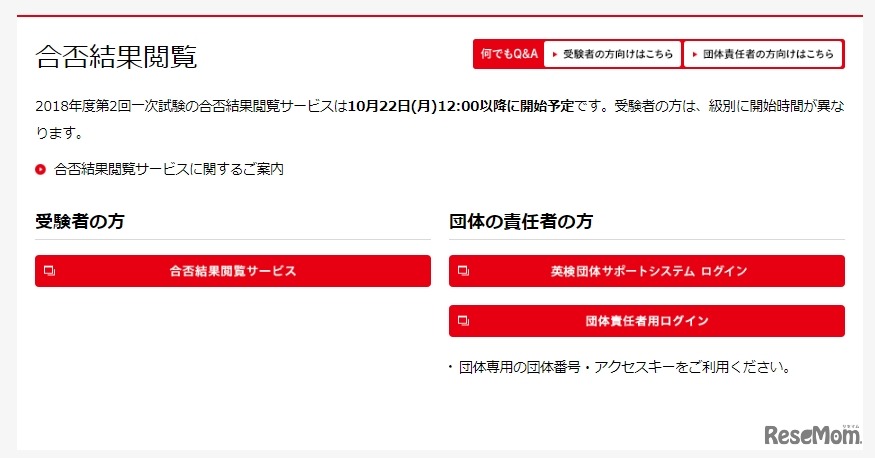 日本英語検定協会は2018年10月22日、Webサイトで「英検2018年度第2回一次試験」の合否結果閲覧サービスを開始する。団体責任者は正午以降、個人(公開会場)が午後3時以降、個人(準会場)が午後4時以降に開始予定。英ナビ!会員向けには先行公開する。