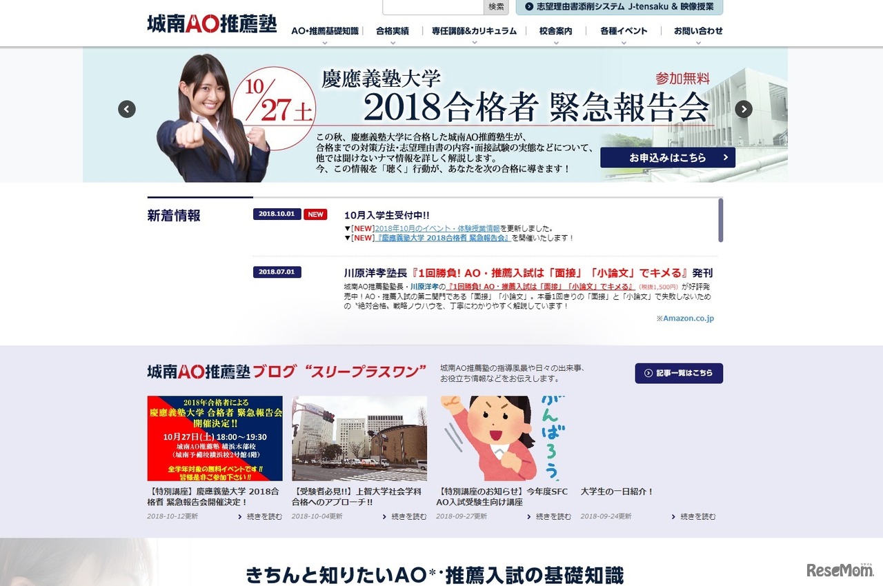 AO・推薦入試対策専門塾「城南AO推薦塾」は2018年10月27日、秋に行われた慶應義塾大学の2019年度AO・推薦入試について、実際に合格した塾生が報告するガイダンス「慶應義塾大学 2018合格者 緊急報告会~法学部-FIT入試・SFC-AO入試の実態を解説する~」を開催する。