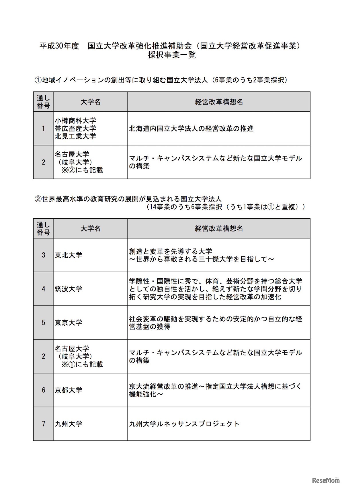 平成30年度(2018年度)国立大学改革強化推進補助金(国立大学経営改革促進事業)採択事業一覧
