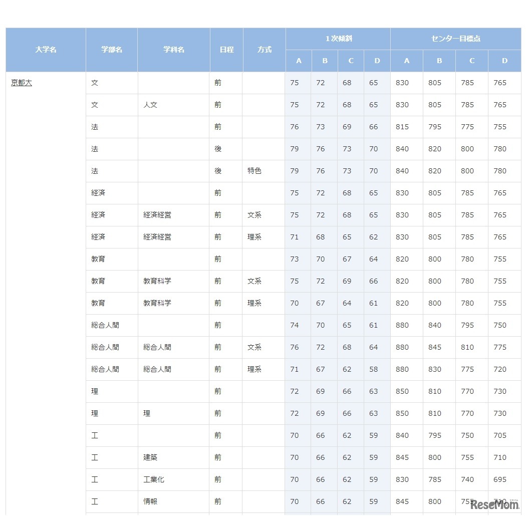 合格可能性判定基準9月版(京都大学・一部)