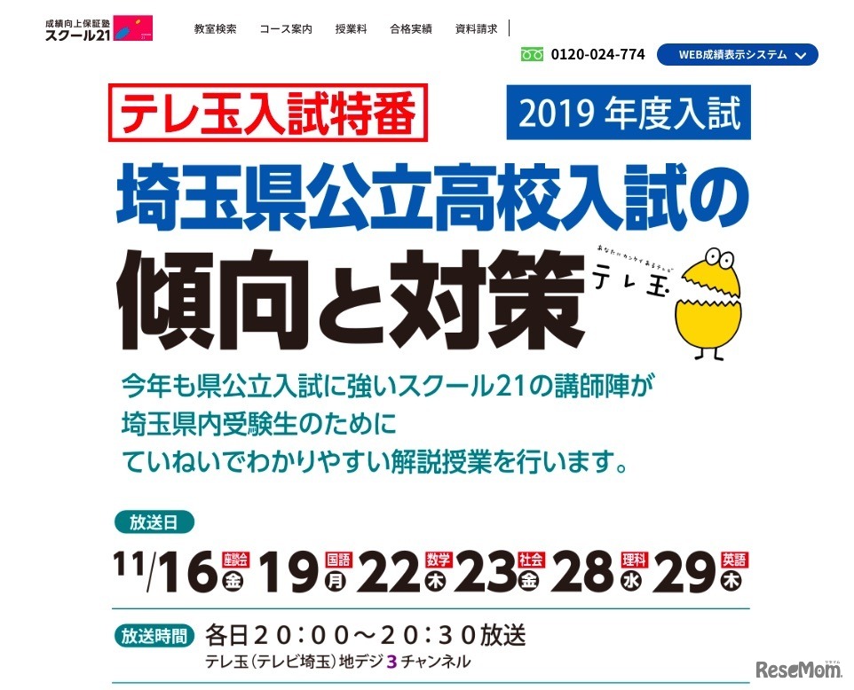 埼玉県内で学習塾を展開するスクール21は2018年11月、テレビ埼玉にて2019年度埼玉県公立高校入試の傾向と対策について入試特番を放送する。国語、数学、社会、理科、英語の解説授業のほか、座談会も放送予定。12月には再放送も行うという。