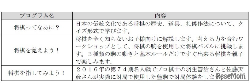 「親子で楽しむはじめての将棋」プログラム概要