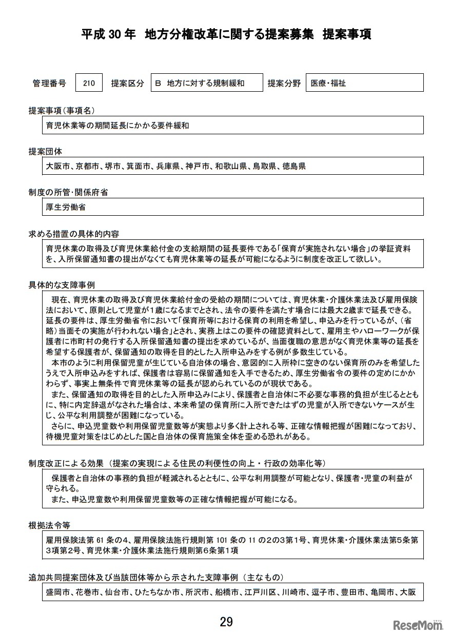 保育園利用希望者に対して入所できなかった場合に育児休業の延長が可能か否かを表示させ、育児休業延長を目的とした保育所への申込みを抑制し、保育ニーズの高い人を優先的に扱うよう厚生労働省が検討していることが、2018年10月22日の専門部会配布資料からわかった。
