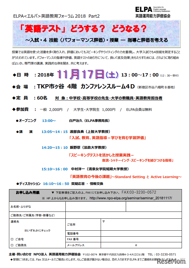 英語運用能力評価協会(ELPA)は2018年11月17日に、「ELPA英語教育フォーラム2018」を開催する。受講料は会員無料、一般2,000円、大学生・大学院生1,000円。