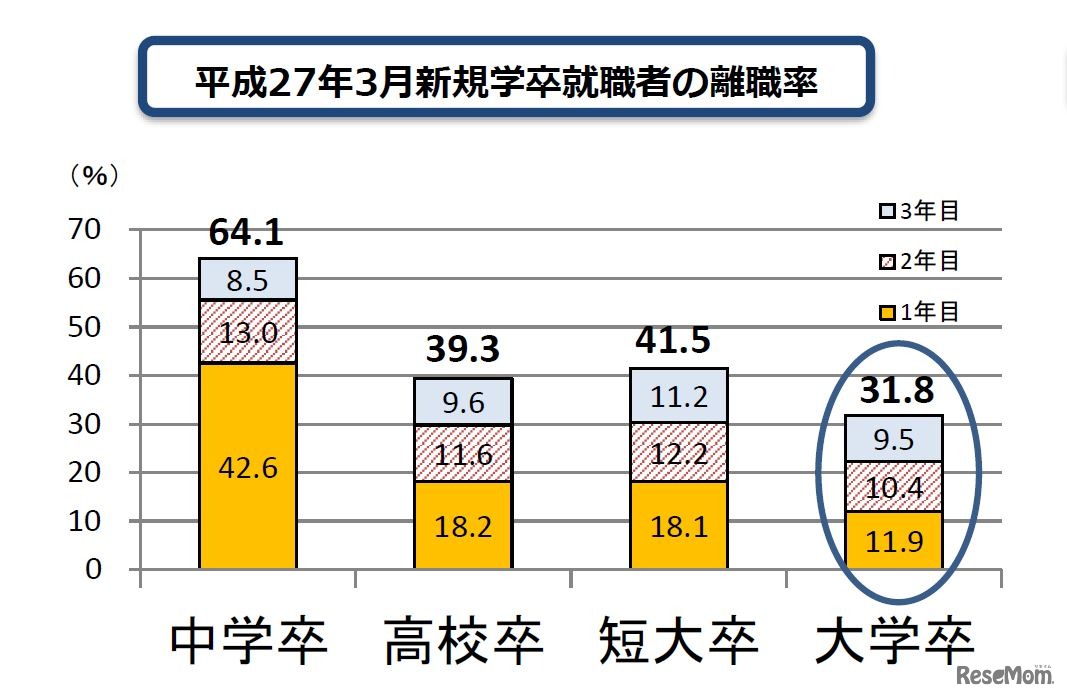 厚生労働省は2018年10月23日、新規学卒就職者の離職状況(2015年3月卒業者の状況)を公表した。大卒者の就職後3年以内の離職率は31.8%で、前年より0.4ポイント減少した。事業所規模が小さいほど離職率が高い傾向にあり、5人未満の事業所の離職率は57.0%にのぼった。
