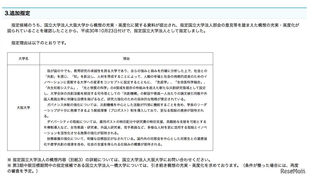 画像出典:文部科学省 大阪大学 追加指定の理由