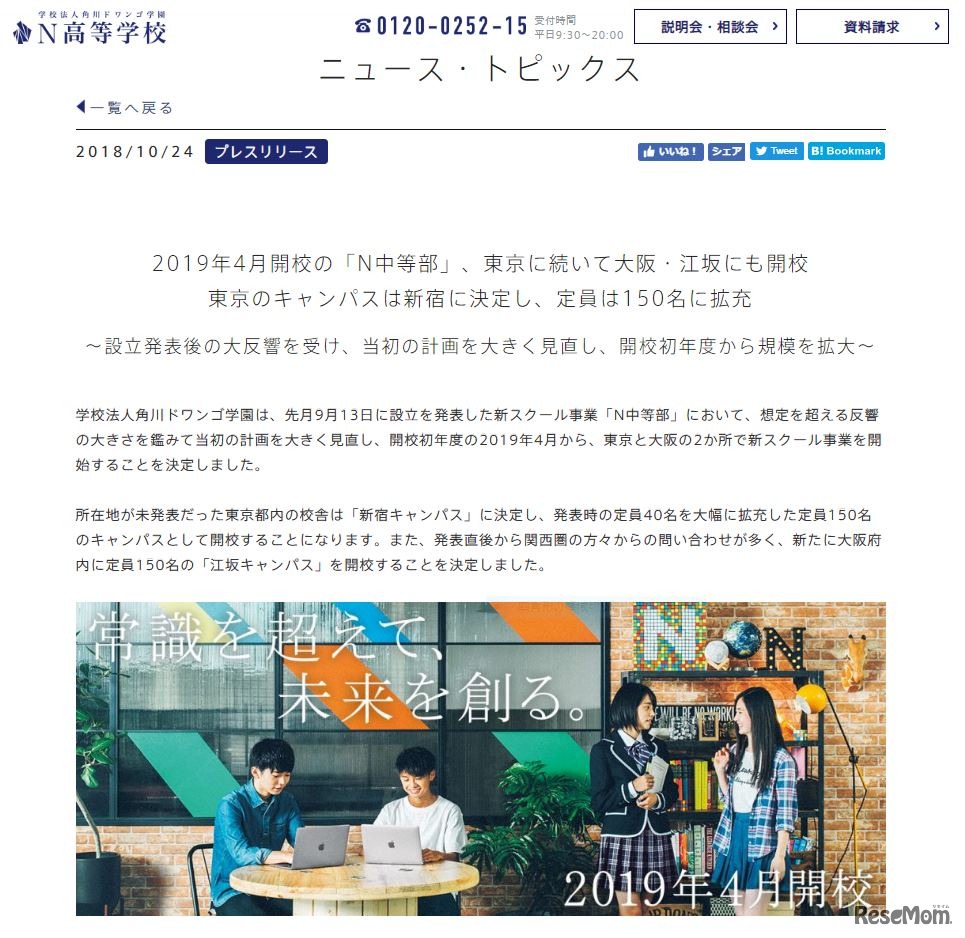 角川ドワンゴ学園は2018年9月13日に設立を発表した新スクール事業「N中等部」を、開校初年度の2019年4月から東京・新宿キャンパスと大阪・江坂キャンパスの2か所で開校するよう変更・決定した。定員は発表時の40名から大幅に拡充し各キャンパス150名。