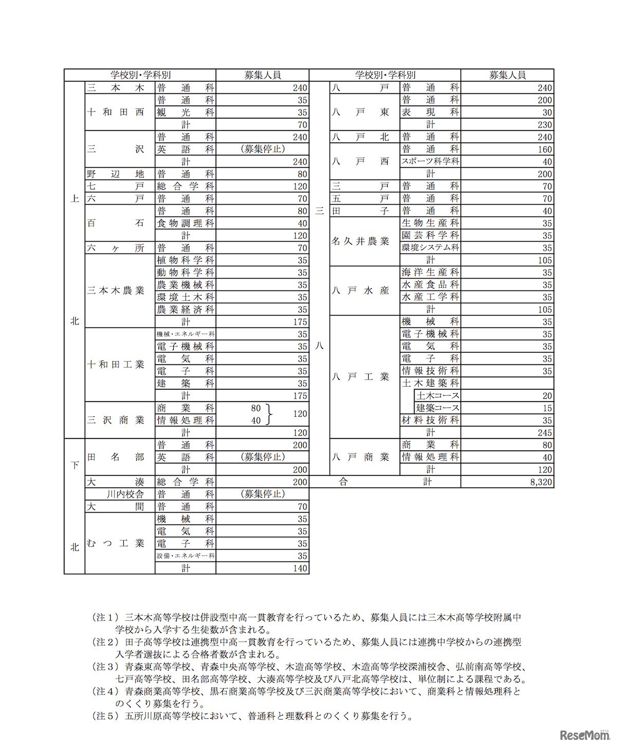 青森県教育委員会は2018年10月24日、平成31年度(2019年度)青森県立高等学校・中学校入学者募集人員を公表した。中学校卒業予定者数は1万1,250人と見込まれ、全日制は前年度比345人減の8,320人を募集する。青森県立三本木高等学校附属中学校の募集人員は80人。