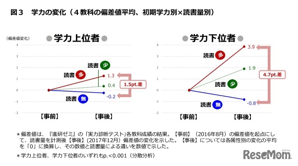読書は学力が低い子どもたちにプラス効果が大きく、たくさん読書をしている子どもほど学力が向上することが、ベネッセ教育総合研究所が2018年10月26日に発表した調査結果より明らかになった。読書量は特に「算数」で偏差値の変化の差が大きいという。