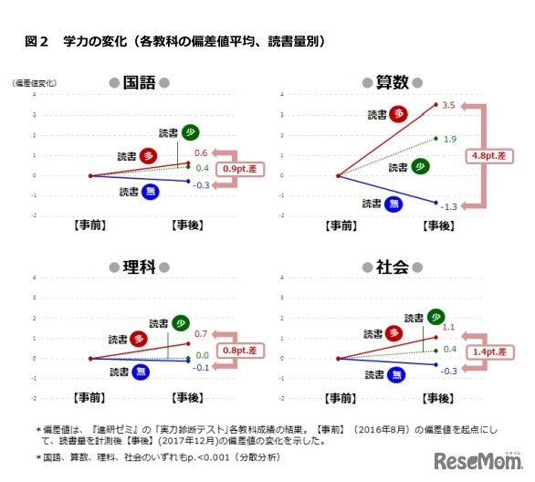 読書は学力が低い子どもたちにプラス効果が大きく、たくさん読書をしている子どもほど学力が向上することが、ベネッセ教育総合研究所が2018年10月26日に発表した調査結果より明らかになった。読書量は特に「算数」で偏差値の変化の差が大きいという。