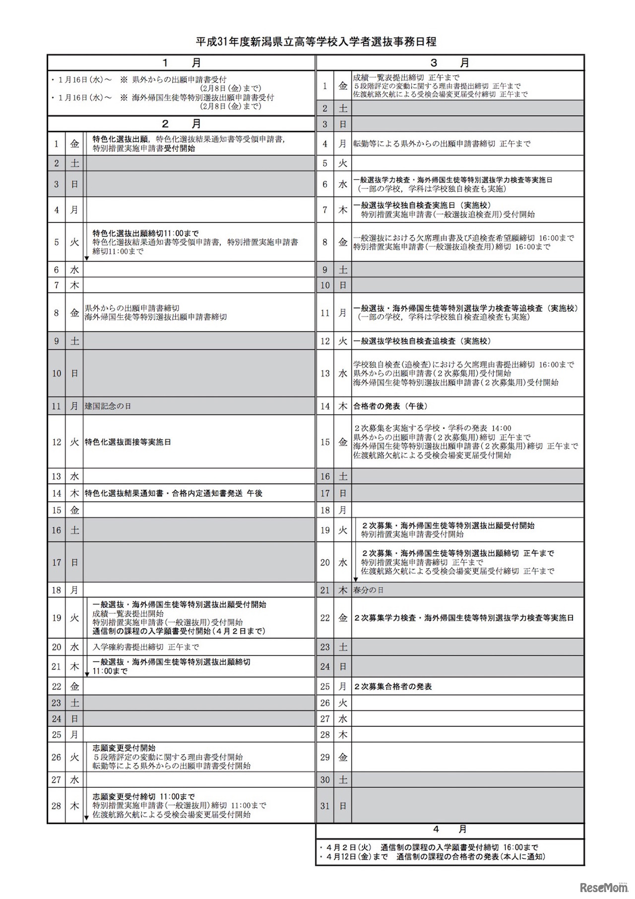 平成31年度新潟県立高等学校入学者選抜事務日程