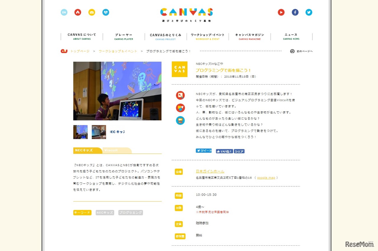 CANVASは2018年11月18日、日本ガイシホールにて「NECキッズinなごや プログラミングで街を描こう!」を開催する。子ども向けプログラミング言語「Viscuit(ビスケット)」を使って街を描く。対象は4歳以上。参加無料。事前申込不要。