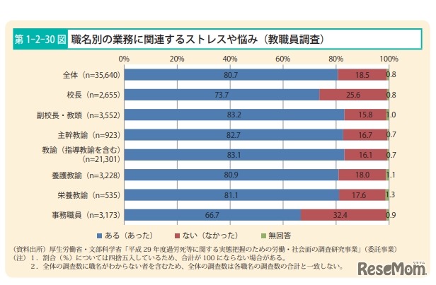 教職員の80.7%が業務に関連するストレスや悩みを抱えており、最多の原因は「長時間勤務の多さ」であることが、厚生労働省が2018年10月30日に発表した「過労死等防止対策白書」より明らかになった。教職員の平均実勤務時間は11時間17分だった。