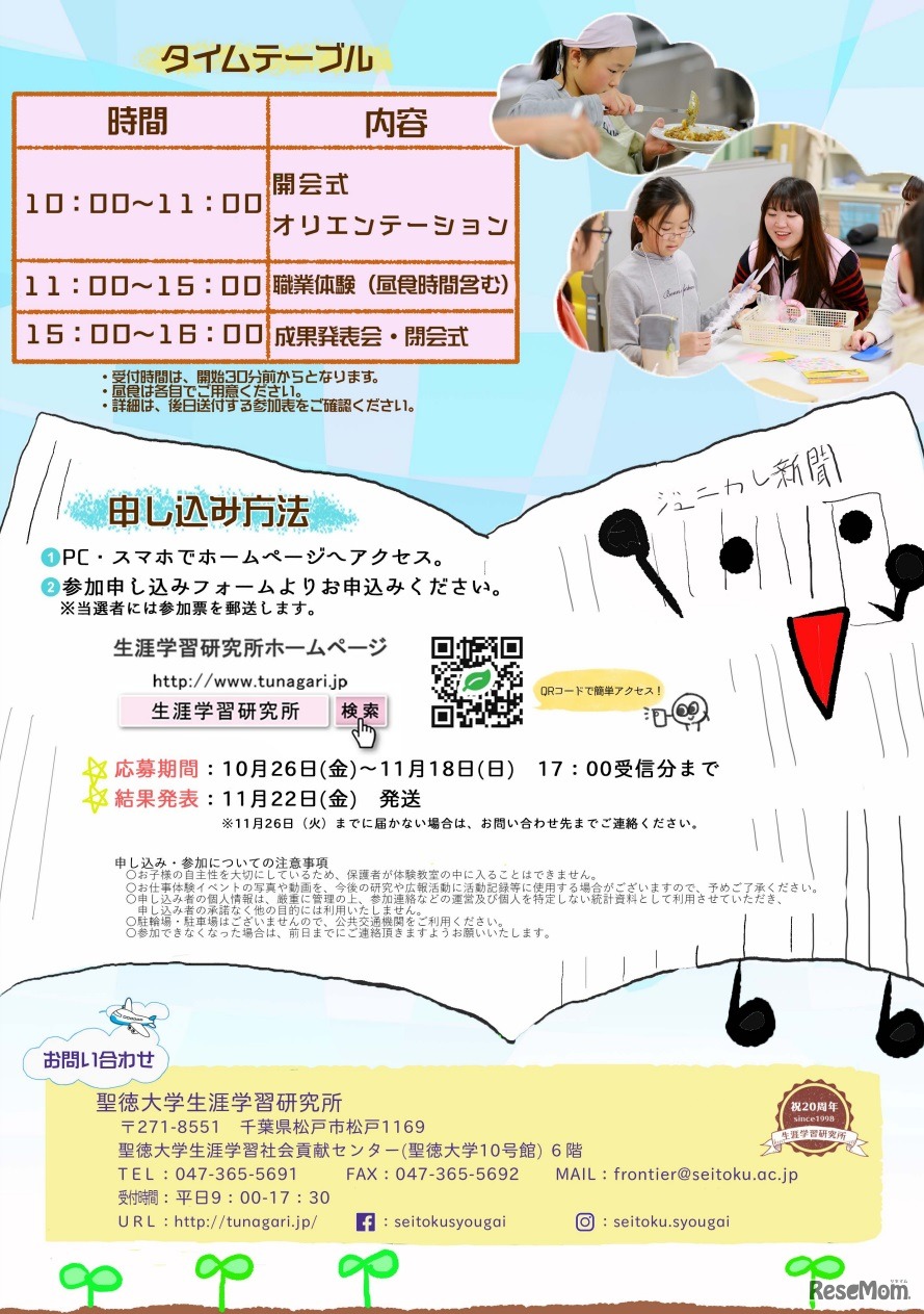 聖徳大学生涯学習研究所は2018年12月2日、小学4年生から中学生を対象に職業体験イベント「ジュニア夢カレッジ4~プロから学ぶお仕事体験~」を開催する。キャビンアテンダントや看護師、鉄道職員など10種類の職業体験を用意している。参加無料。事前申込制。