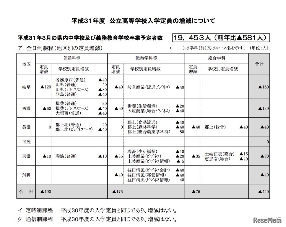 画像出典:岐阜県教育委員会「平成31年度 公立高等学校入学定員について」 平成31年度(2019年度)岐阜県公立高等学校入学定員の増減について