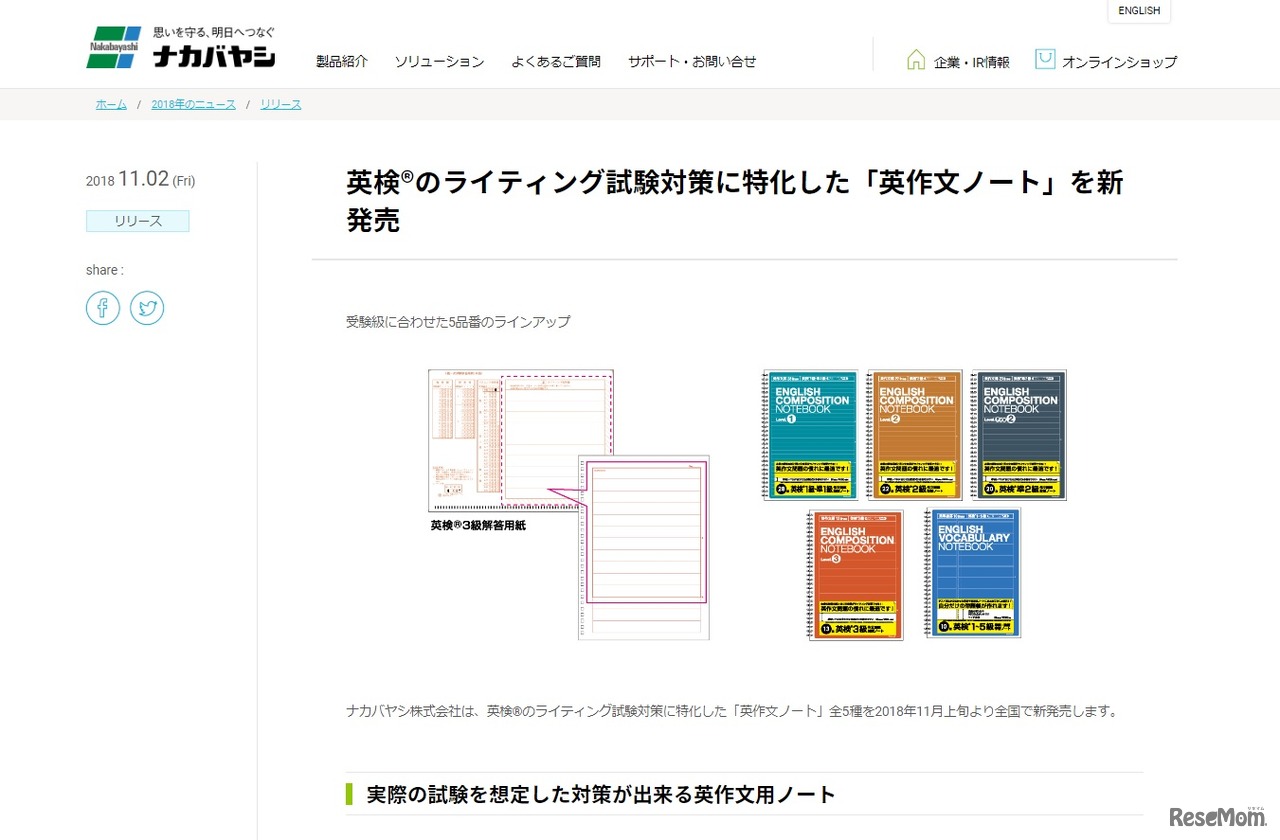 ナカバヤシは2018年11月上旬、実用英語技能検定(英検)のライティング試験対策に特化した「英作文ノート」を全国で新発売する。ラインアップは、英作文対策用ノート4種と英単語対策用ノート1種の全5種。価格は各320円(税別)。