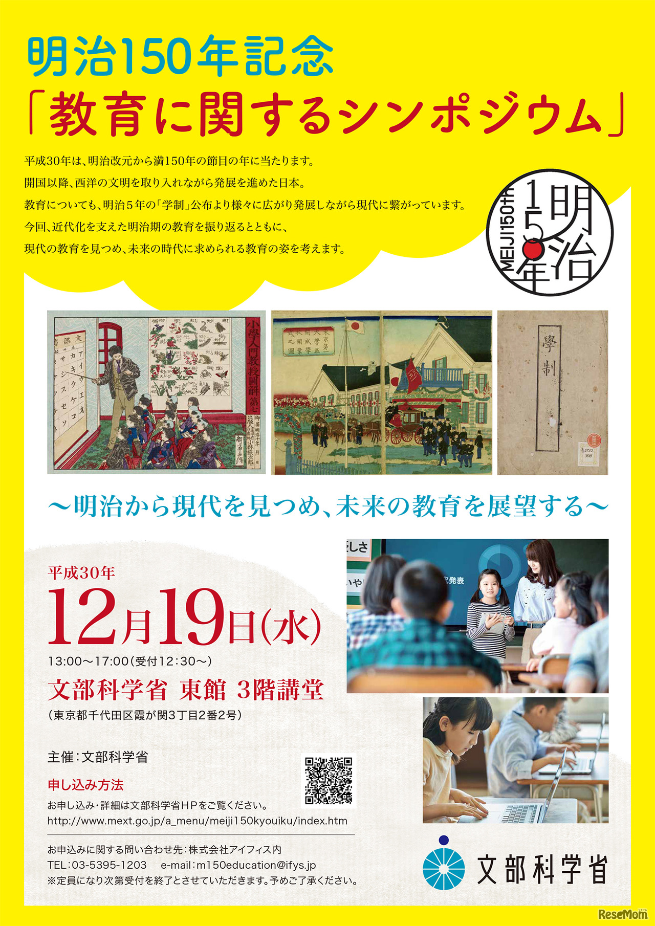 今年が明治改元から満150年の節目の年にあたることを記念し、文部科学省は2018年12月19日、「教育に関するシンポジウム」を文部科学省東館3階講堂にて開催する。事前申込制、参加費は無料。