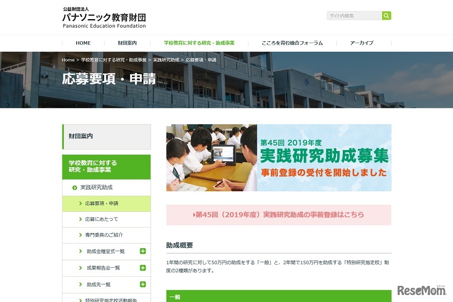 パナソニック教育財団は、「学校現場における、ICTを活用した教育の実践研究」を対象とする助成プログラム「実践研究助成」の第45回(2019年度)を募集している。事前登録はWebサイトにて2019年1月20日まで受け付けている。