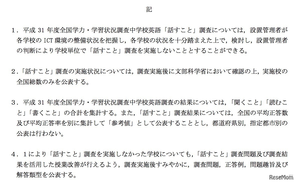 文部科学省は2018年11月12日、教育委員会などに向けて「平成31年度(2019年度)全国学力・学習状況調査の中学校英語『話すこと』調査の実施について」通知した。2019年度調査に限り、設置管理者の判断で調査を実施しないことが可能となる特例措置を講じる。