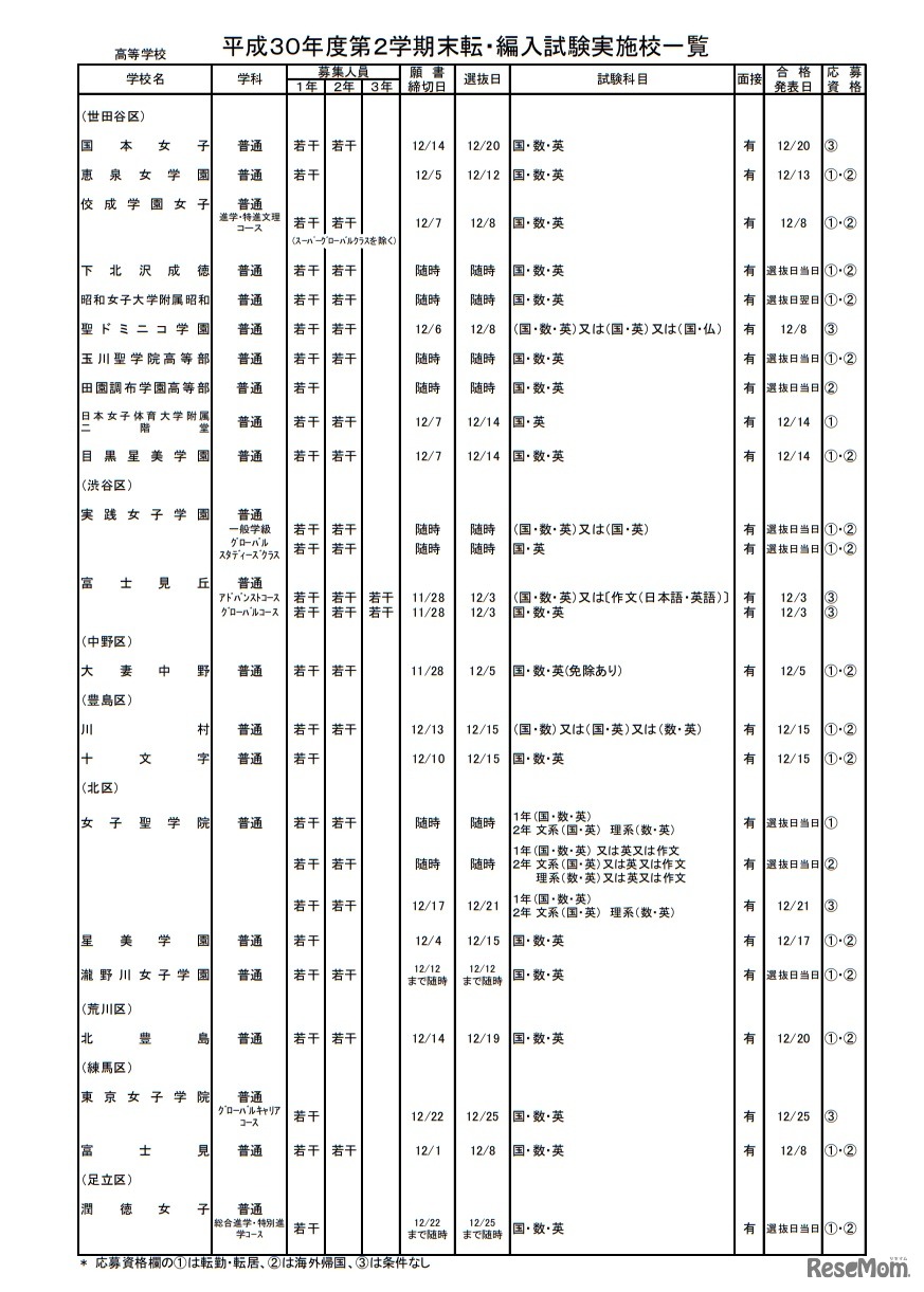 画像出典:東京都「平成30年度第2学期末転・編入試験実施校一覧」 私立高校・女子校