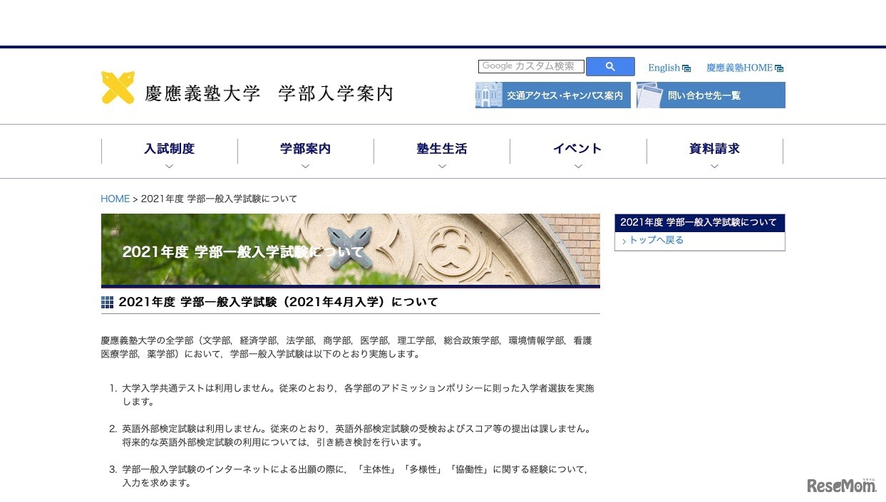 慶應義塾大学は2018年11月19日、2021年度から現行の大学入試センター試験に代わって導入される「大学入学共通テスト」について、全学部で利用しないと発表した。英語外部検定試験についても、2021年度一般入試については全学部で利用を見送る。