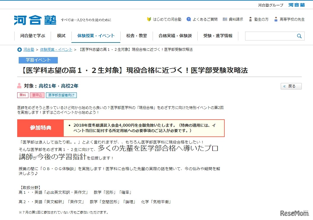 河合塾は、医学部医学科をめざす高校1・2年生を対象としたイベント「現役合格に近づく!医学部受験攻略法」を2018年12月9日に大阪校医進館で開催する。参加無料、事前申込みが必要。授業の間に「OB・OG体験談」を実施する。