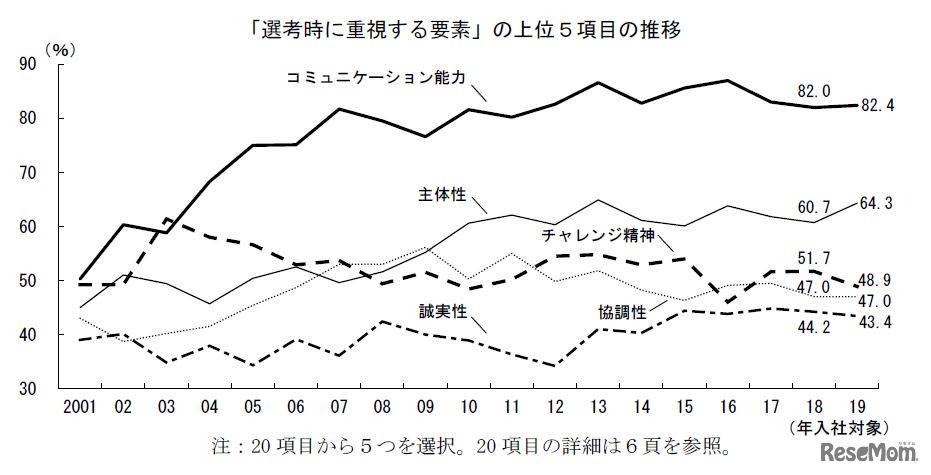 日本経済団体連合会(経団連)は2018年11月22日、「2018年度 新卒採用に関するアンケート調査」の結果を公表した。新卒採用市場を「前年より売り手市場」と評価した企業は3年連続で8割に達した。選考で重視した点は、「コミュニケーション能力」が16年連続で1位だった。