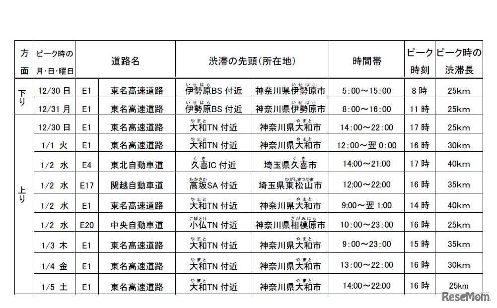 NEXCO東日本の関東支社およびNEXCO中日本の東京支社・八王子支社は、首都圏の高速道路における年末年始の渋滞予測を発表した。10km以上の渋滞がもっとも多く発生すると予測される日は、上下線ともに2019年1月2日。渋滞予測区間のほか、渋滞回避も呼びかけている。