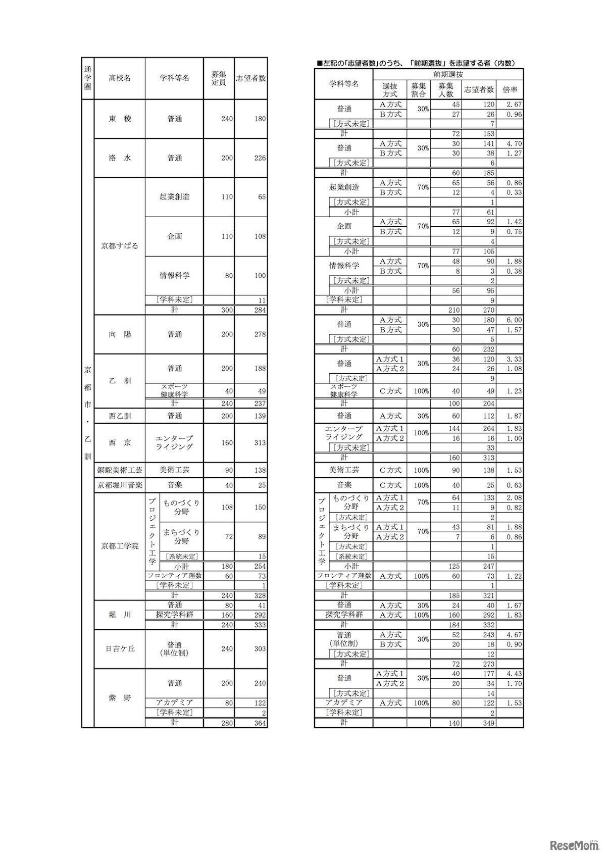 画像出典:京都府教育委員会「平成31年3月中学校及び特別支援学校中学部等卒業予定者の進路希望状況」2018年11月30日発表 公立高等学校 学校別・学科別志望状況(2018年11月10日現在)