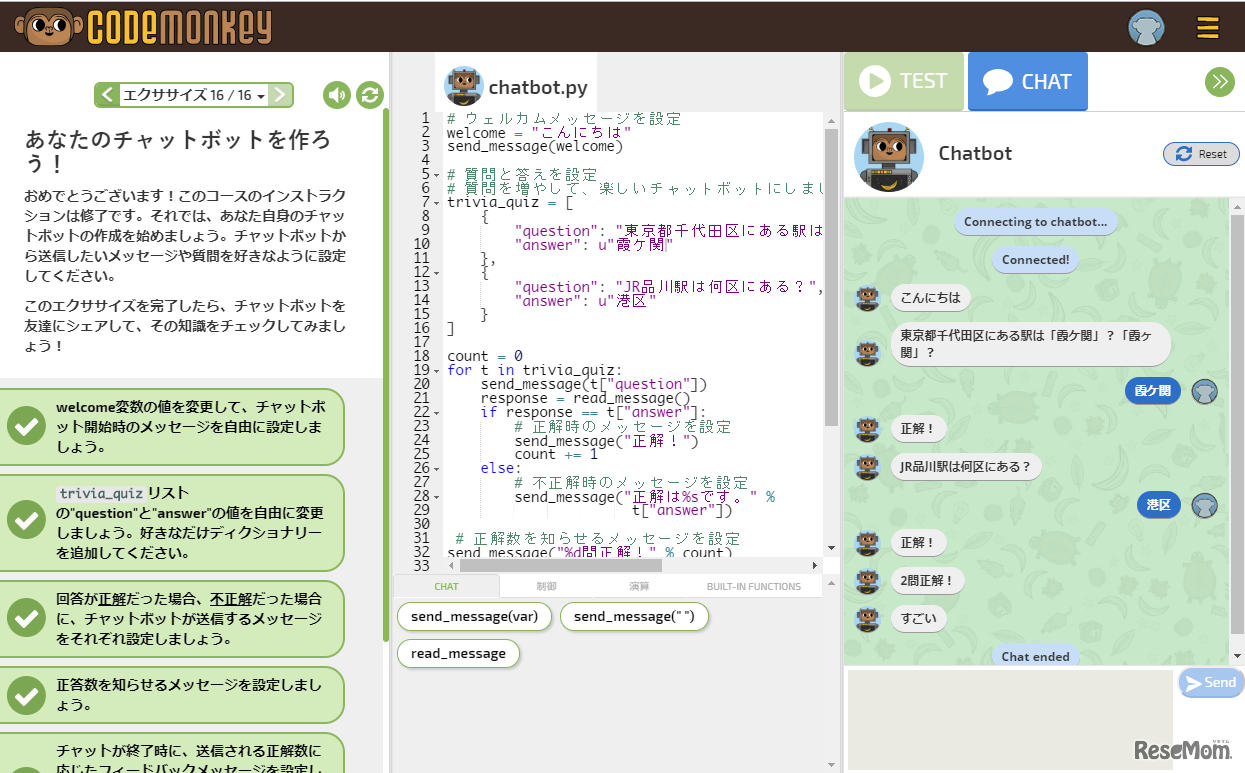 課題達成型のプログラミング教材「コードモンキー/コードの冒険」の開発元であるコードモンキー・スタジオは、2018年12月の「コンピューターサイエンス教育週間」に合わせ、チャットボットづくりを体験できる「トリビアチャットボット」日本語版の無償公開を開始した。
