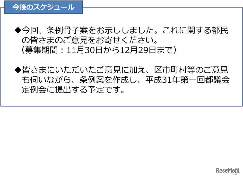 東京都は2018年11月30日、「東京都子供への虐待の防止等に関する条例(仮称)」の骨子案を取りまとめ、発表した。同時に都民からの意見の募集を開始した。意見募集期間は2018年12月29日までで、郵送の場合は当日消印有効。