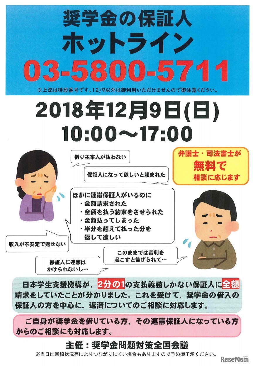 奨学金問題対策全国会議は2018年12月9日、日本学生支援機構が未返還の奨学金において2分の1の支払義務しかない保証人に全額請求をしていた問題を受け、「奨学金の保証人ホットライン」を実施する。奨学金の借入の保証人を中心に、弁護士・司法書士が無料で相談に応じる。