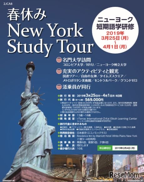 Z会、ISS国際交流センター、シェーン留学センターは、中高生対象の「春休みニューヨーク短期語学研修」を実施する。期間は2019年3月25日から4月1日まで。名門大学訪問やアクティビティが盛り込まれた充実の8日間。申込締切日は2019年2月4日。