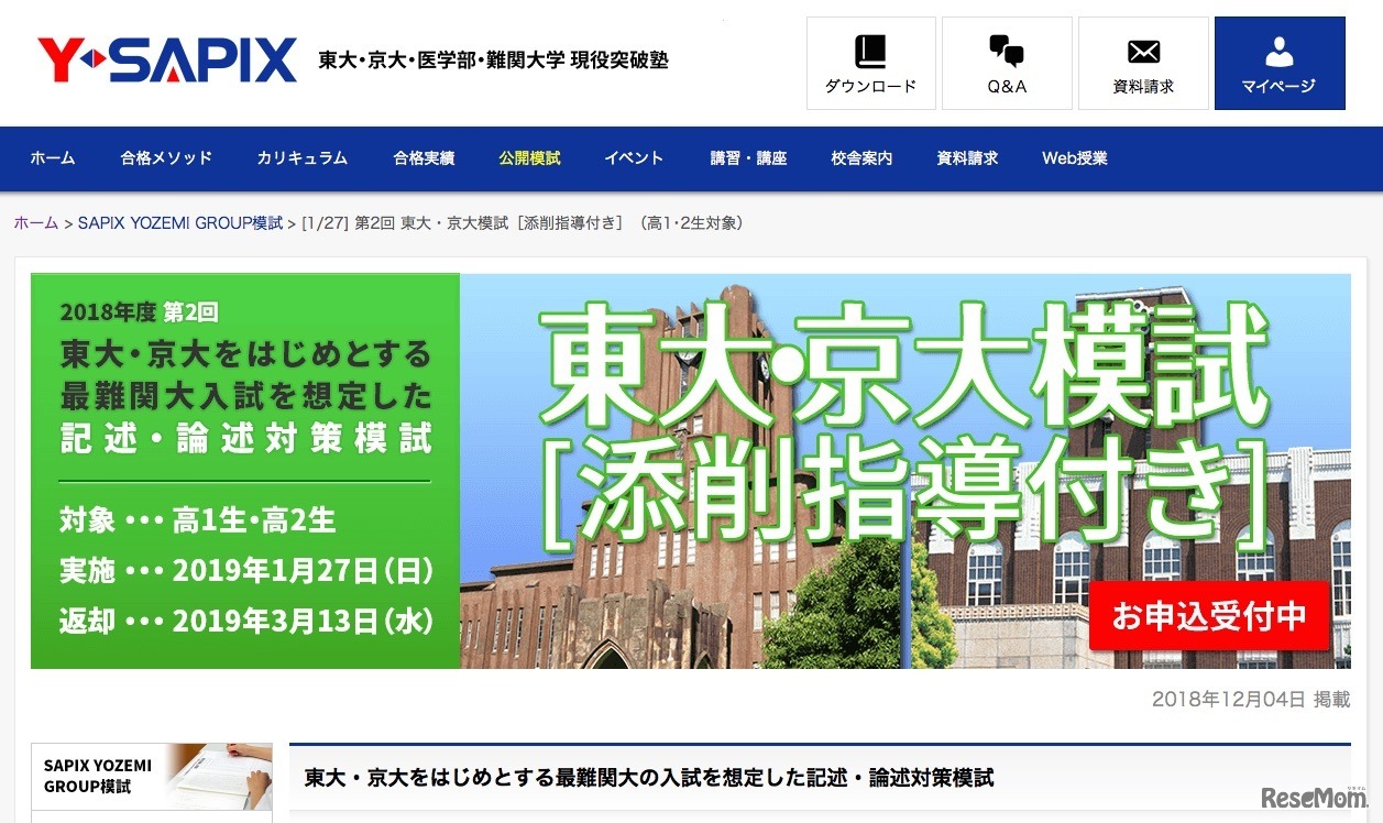 SAPIX YOZEMI GROUPは2019年1月27日、高校1・2年生対象の「第2回 東大・京大模試(添削指導付き)」を開催する。東大や京大をはじめとする最難関大入試を想定した記述・論述対策模試で、受験料は6,000円(税込)。試験終了後には「難関大現役突破ガイダンス」も実施する。
