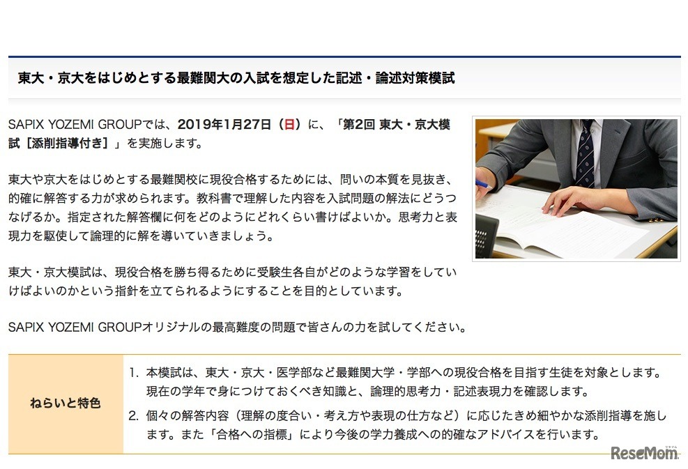 SAPIX YOZEMI GROUPは2019年1月27日、高校1・2年生対象の「第2回 東大・京大模試(添削指導付き)」を開催する。東大や京大をはじめとする最難関大入試を想定した記述・論述対策模試で、受験料は6,000円(税込)。試験終了後には「難関大現役突破ガイダンス」も実施する。