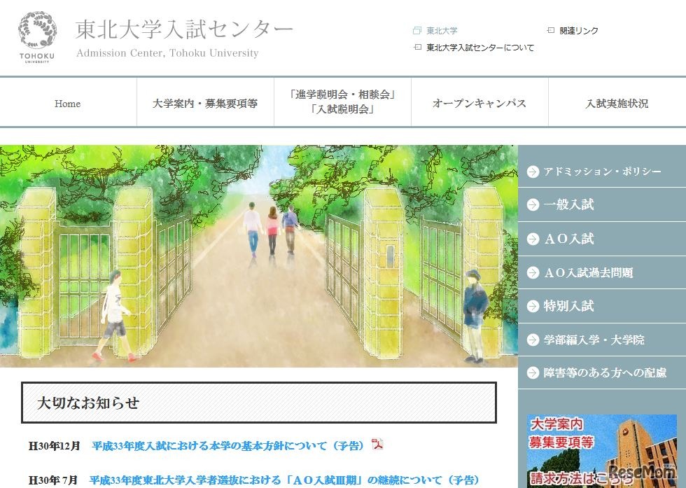 東北大学は2018年12月5日、2021年度入試の基本方針を公表した。大学入学共通テストで利用される英語民間検定試験の受検は出願要件とせず、その成績も合否判定に用いない。新たに導入される記述式問題の成績は、数学のみ合否判定に使う。
