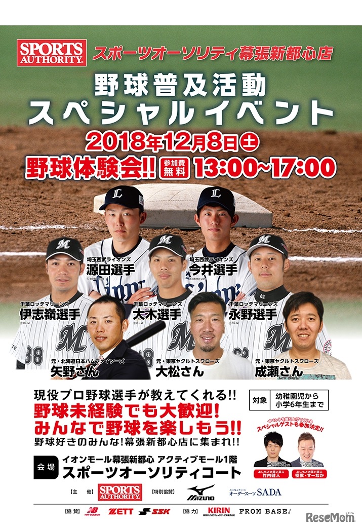 スポーツオーソリティを運営するメガスポーツは2018年12月8日、現役プロ野球選手らが野球の楽しさを伝える「野球普及活動スペシャルイベント」を開催する。未就学児から小学生を対象とした「野球体験会」やトークショーを実施。参加無料、申込不要で当日参加できる。