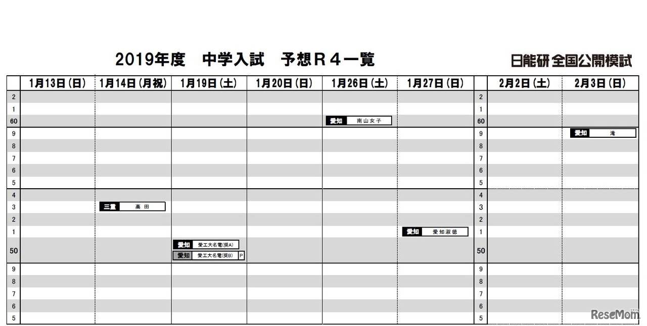 日能研は2018年12月3日、「2019年中学入試予想R4一覧」の首都圏11月20日版と東海11月版を公開した。合格可能性80%ラインの偏差値は、男子が筑波大駒場(72)、開成(71)、女子が桜蔭(67)、女子学院(66)、東海が海陽・特給(68)など。