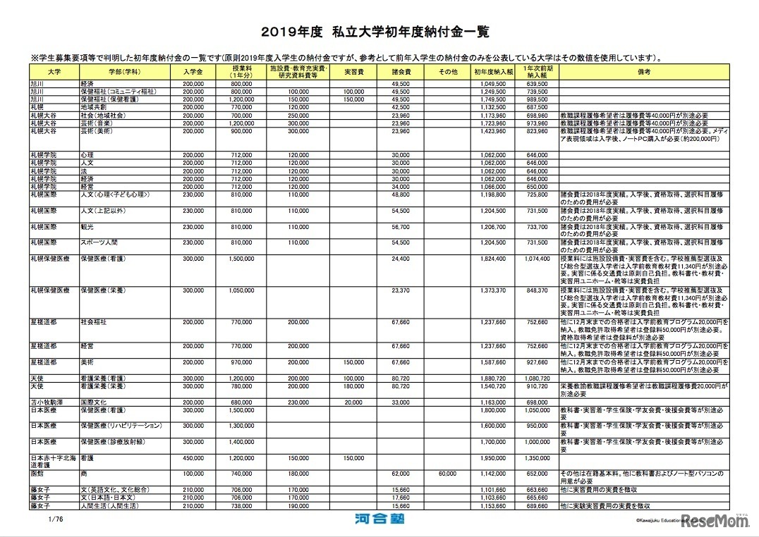 河合塾の大学入試受験サイト「Kei-Net」は2018年12月7日、2019年度入試情報として「私立大学・短期大学・大学校 初年度納付金一覧」を掲載した。各大学・学部の入学金や授業料(1年分)、それらの費用を合計した初年度納入額のほか、別途必要な費用などをまとめている。