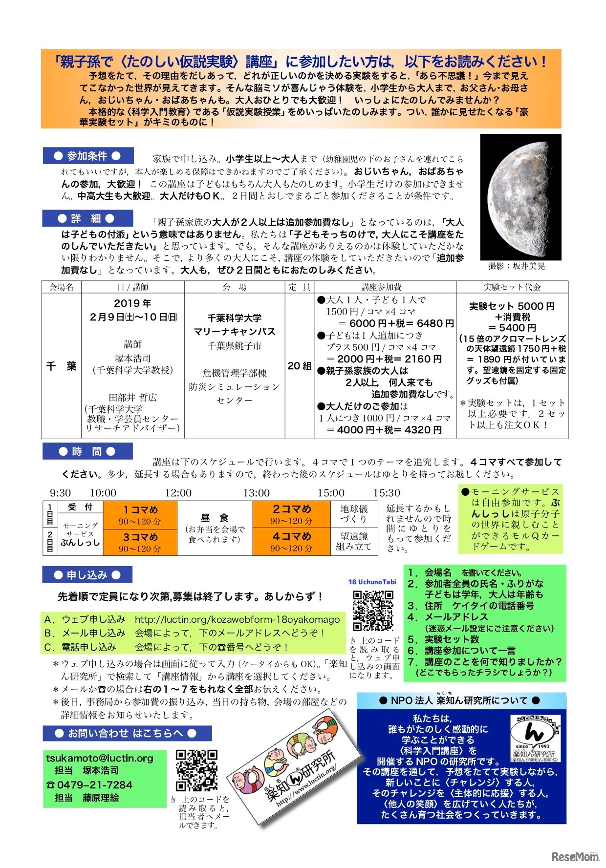 千葉科学大学は2019年2月9日・10日の2日間、マリーナキャンパスの危機管理学部棟防災シミュレーションセンターにて「親子孫で<たのしい仮説実験>講座」を開催する。対象は小学生から大人までで、親子だけでなく大人だけの参加も可能。先着順で定員20組を募集する。