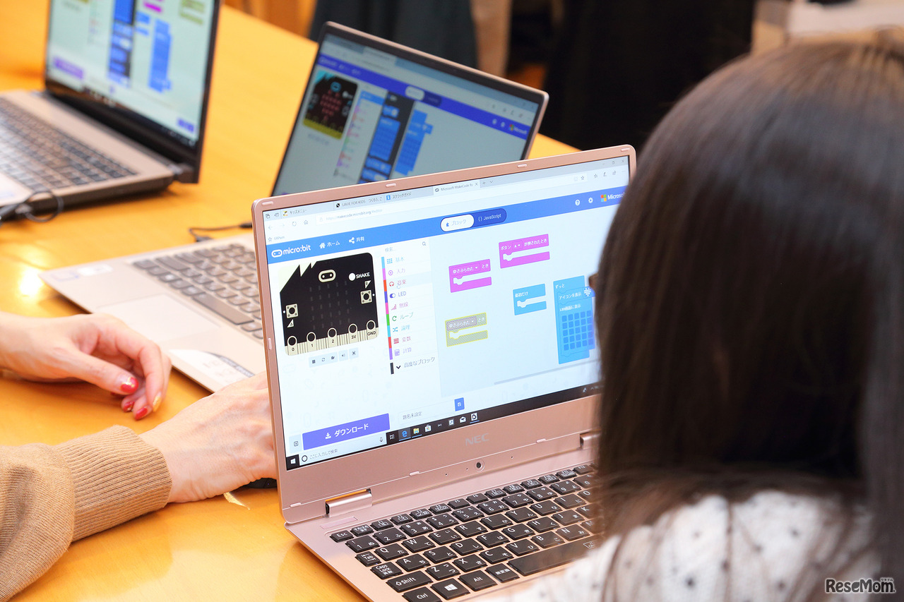 撮影:市原達也 micro:bit に指示をするコードをプログラミングするようす