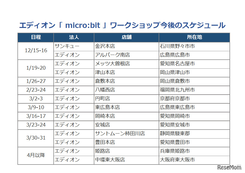 エディオン「 micro:bit 」ワークショップスケジュール(2018年12月現在の予定)