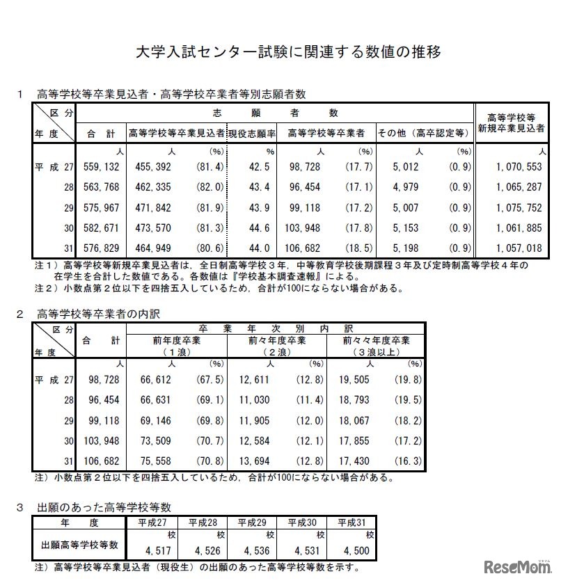 大学入試センターは2018年12月7日、2019年度(平成31年度)大学入試センター試験の確定志願者数と利用大学・短期大学数を発表した。志願者数は57万6,829人で、前年度より5,842人減少した。現役志願率は、前年度より0.6ポイント減の44.0%。利用大学数は過去最多の852校。