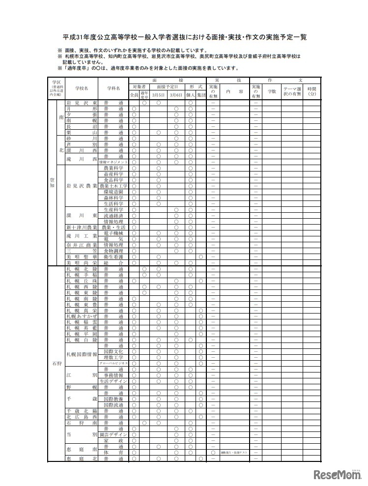 画像出典:北海道教育委員会「平成31年度公立高等学校一般入学者選抜における面接・実技・作文の実施予定一覧」 平成31年度(2019年度)公立高等学校一般入学者選抜における面接・実技・作文の実施予定一覧
